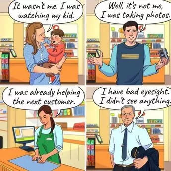 A fenti képen négy ember látható, és csak az egyikük hazudik az alibijéről. Először is, a kisbabás anyuka azt állítja, hogy nem tudta elvenni a pénztárcát, mert „vigyázott a babára”, a fényképezőgépes férfi pedig azt állítja, hogy nem ő volt, mert „fényképezett”.