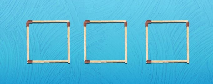 Ez a feladat próbára teszi a logikus gondolkodásodat. Az alábbiakban egy kollázst láthatsz, ahol három egyforma négyzetet raknak ki gyufával. Összesen 12 gyufát használnak fel.
