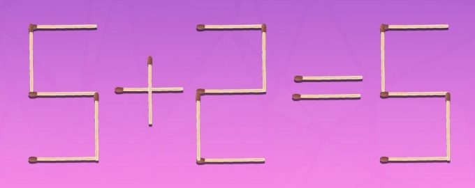 Az alábbiakban egy olyan képet láthatsz, ahol az 5+2=5 egyenlőséget gyufákkal rakjuk ki. Összesen 19 gyufát használtunk.