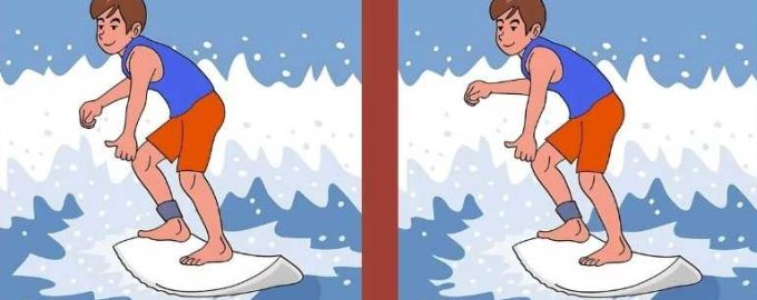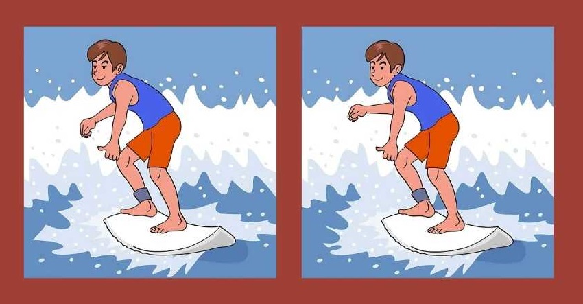 A képen egy szörfös srácot látunk, aki szörfdeszkán hódítja meg a hullámokat. Első ránézésre úgy tűnhet, hogy a két képen látható srác egyforma, de ha jobban megnézzük, kiderül, hogy nem így van – valahol van néhány különbség, ami miatt a képek különböznek.